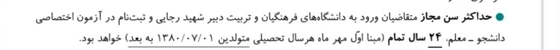 امسال به صورت قطعی و طبق اطلاعیه ثبت نام کنکور سراسری و فرهنگیان ۱۴۰۴، شاهد حداکثر سن ثبت نام در کنکور فرهنگیان با عدد ۲۴ بوده ایم و داوطلبین متولد ۱۳۸۰/۰۷/۰۱ به بعد میتوانند در این دانشگاه پذیرفته شوند.